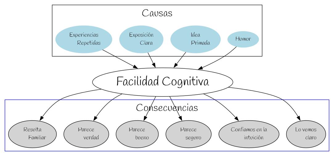 La repetición de un evento o experiencia, la exposición clara y sin palabras sofisticadas, ideas primadas, el buen humor, pueden generar facilidad cognitiva con una idea o intuición.
